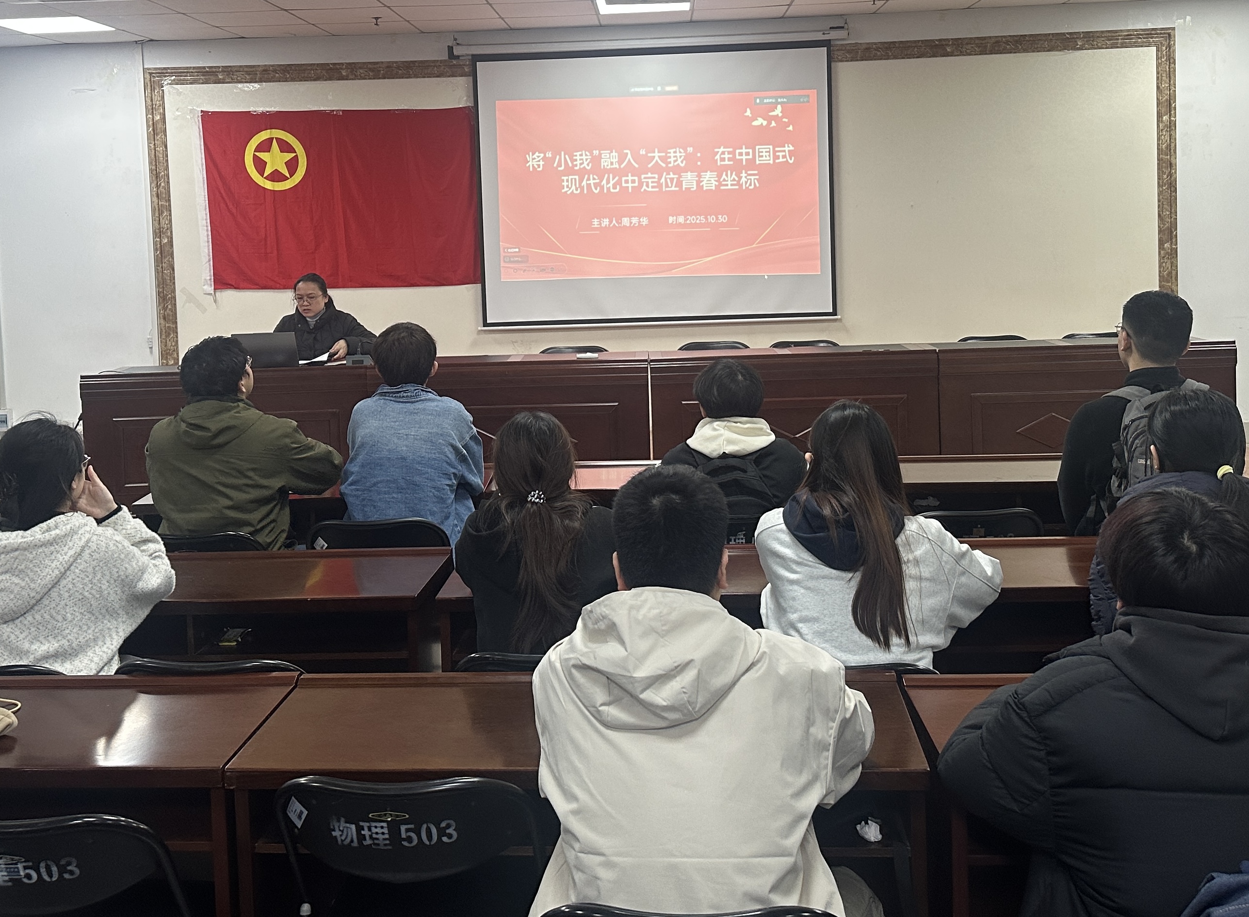 10月30日中午,电子信息学院在四教楼503会议室开展“在中国式现代化中定位青春坐标”主题团课。本次团课由校青年讲师团成员、学院团委书记周芳华主讲,学院全体入团积极分子参加了学习。