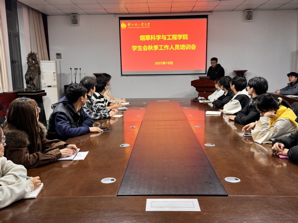 为深入学习贯彻习近平总书记关于青年工作的重要思想,精准把握2025年秋季学期学生工作的重点方向,切实提升学生会干部的服务意识与履职能力,近日,烟草科学与工程学院于学院401会议室召开2025年学生会秋季工作人员培训会。学院团委工作负责老师景天,全体学生会成员参会。