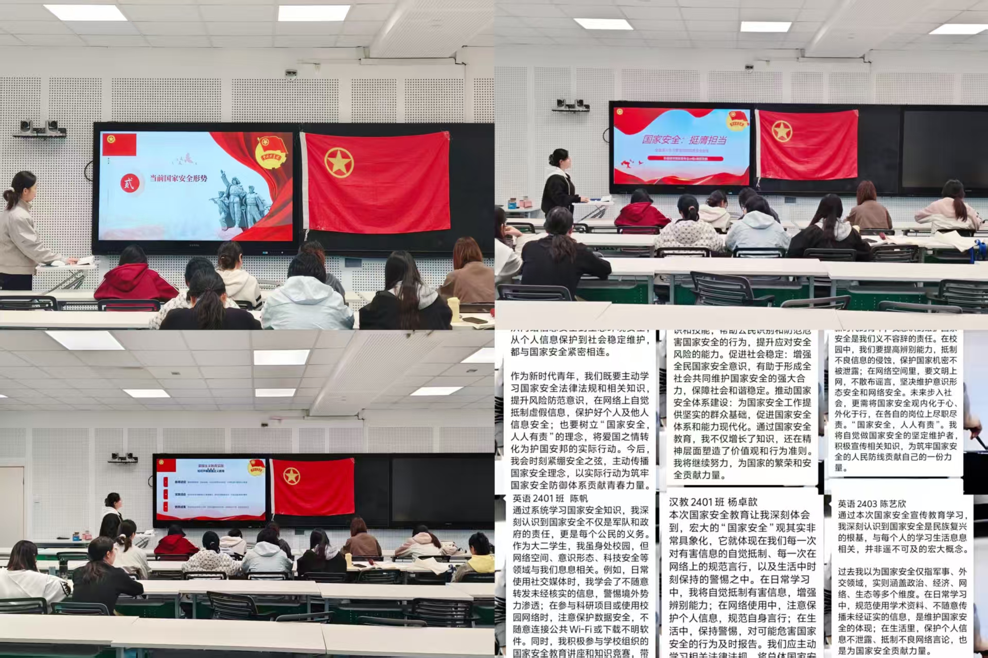 为深入贯彻总体国家安全观,积极响应国家安全宣传周的号召,大力弘扬爱国主义精神,近日,外国语学院各基层团组织开展了以“国家安全,青春挺膺”主题团日活动。