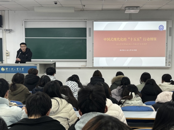 会上,景天老师围绕党的二十届四中全会审议通过的《中共中央关于制定国民经济和社会发展第十五个五年规划的建议》,系统阐释了“十五五”时期的战略定位、指导方针与重点任务,尤其聚焦科技自立自强、新质生产力发展、美丽中国建设、共同富裕推进等国家发展全局的重大部署,结合国内外发展形势,生动解读了全会精神的现实意义与历史影响。随后,针对在场青年学生,景天老师强调要将个人成长与国家发展大局紧密结合,鼓励同学们在专业领域深耕钻研,以实际行动践行“强国有我”的青春誓言。随后对团学骨干提出要求,要以全会精神为指引,在服务同学、组织实践中提升综合能力,打造有凝聚力、有行动力的青年队伍。最后,景天老师激励在场同学以本次宣讲为起点,持续深化对全会精神的学习领悟,将青春热情转化为奋斗动力,在强国建设、民族复兴的征程中展现青年学子的担当。