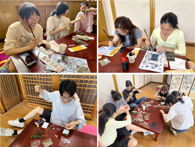 活动现场陈列笔墨纸砚、艾草、彩线、香料及各式布料,同学们通过书写书签互送祝福,师生共同学习粽子福袋的制作技艺。大家穿针引线、填充香料,将艾草的清香与祝福缝入福袋。尽管有部分同学初次尝试针线活,但在互助协作下,一个个精巧的福袋渐渐成形,活动现场洋溢着欢声笑语。毕业生们表示:“一针一线绣的是同窗情谊,更是对传统文化的认同,这份礼物最有温度!”