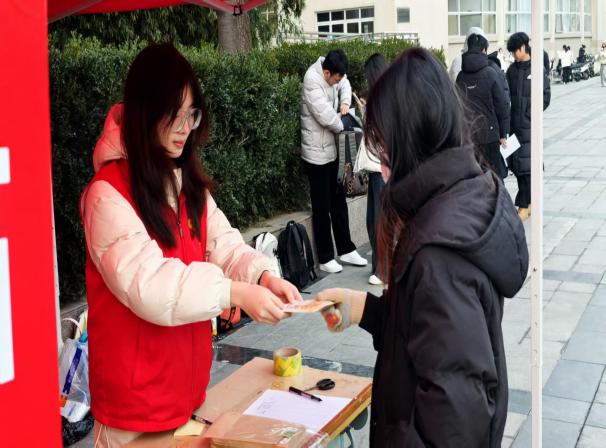 活动前期,青年志愿者协会分别在科学校区二教楼708室和东风校区教三楼105室开展专题培训、岗前动员与流程演练。志愿服务期间,尽管天气寒冷,志愿者们仍以饱满的热情投入工作,准时集合,迅速完成物资整理、帐篷搭建、登记台布置等准备工作。服务中,志愿者们耐心提醒考生“手机、背包等物品禁止带入考场”,并逐一登记、妥善保管考生交付的手机等贵重物品。此外,志愿者们还贴心准备了暖宝宝和口罩等物资,为考生送去温暖与鼓励。在整个志愿服务过程中,无一件物品丢失或错领,本次志愿服务工作圆满完成。