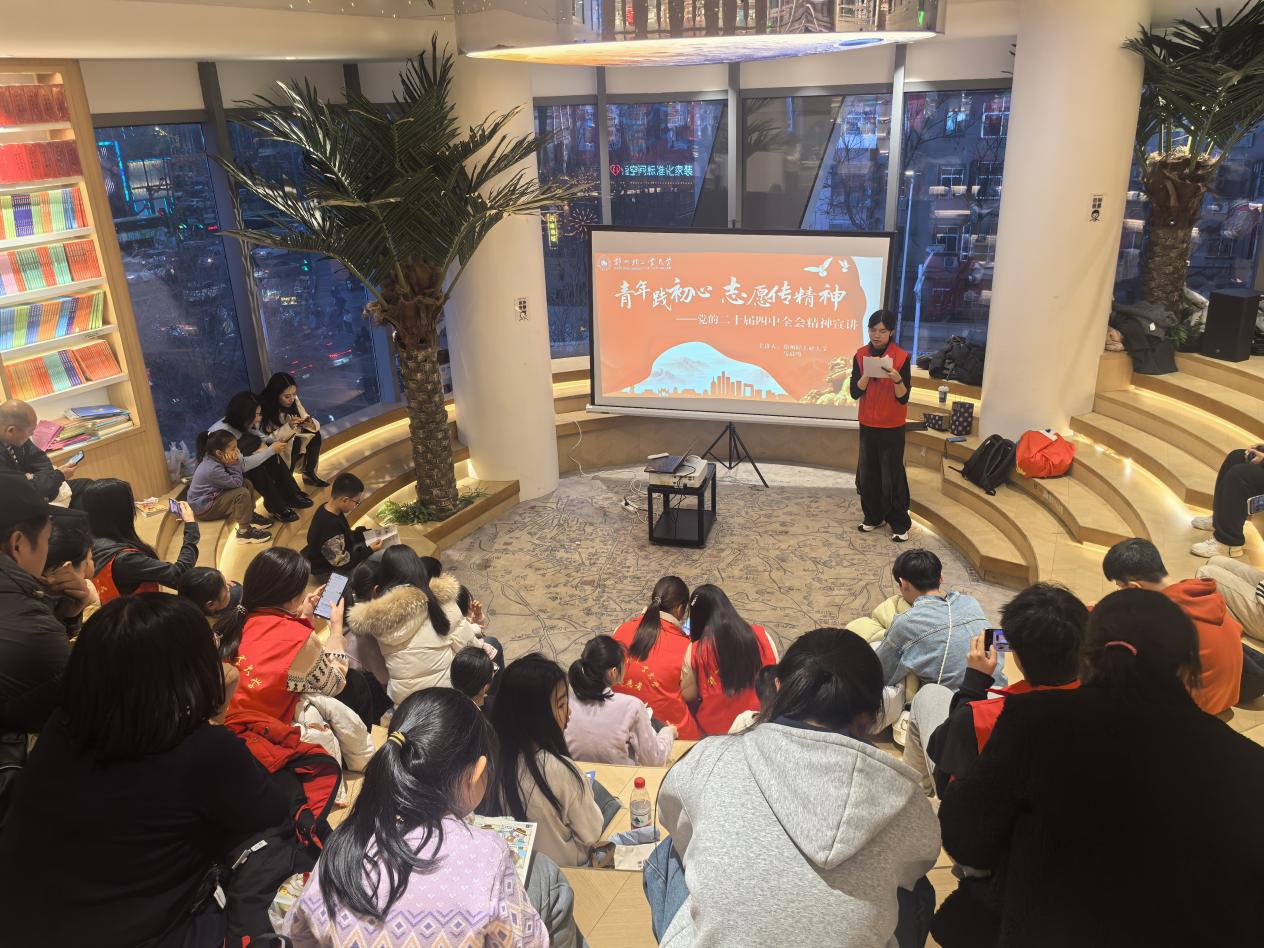 为深入学习贯彻党的二十届四中全会精神,落实立德树人根本任务,引导青年学生在社会实践中感受中国式现代化建设的生动实践,2月1日晚,学校青年志愿者协会走进郑州购书中心,开展以“青春践初心,志愿传精神”为主题的党的二十届四中全会精神宣讲,推动全会精神走进群众、深入人心。