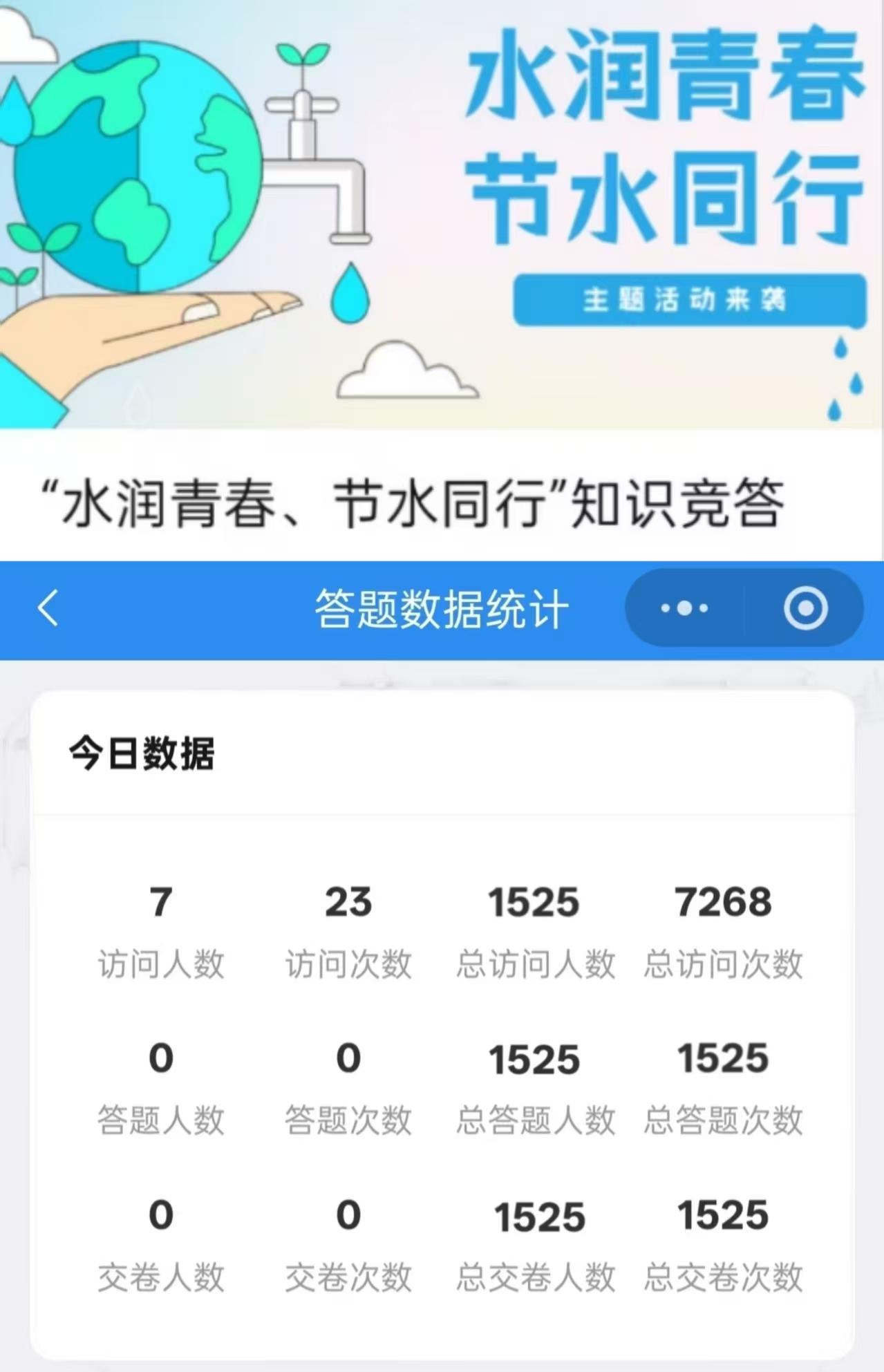 本次竞答内容涵盖用水常识、水资源保护、低碳生活等内容,累计答题人数1525人。本次活动不仅为学生提供了展示平台,更是一次生动的节水知识科普,通过寓教于乐的竞答形式,以赛促学、以赛促行,让同学们在轻松愉快的氛围中巩固节水知识,增强保护生态环境、珍惜水资源的责任意识,让节水护水理念深入人心。大家纷纷表示,将把节水护水理念融入日常学习、工作和生活,从点滴做起,珍惜水资源,带动更多人共同行动。