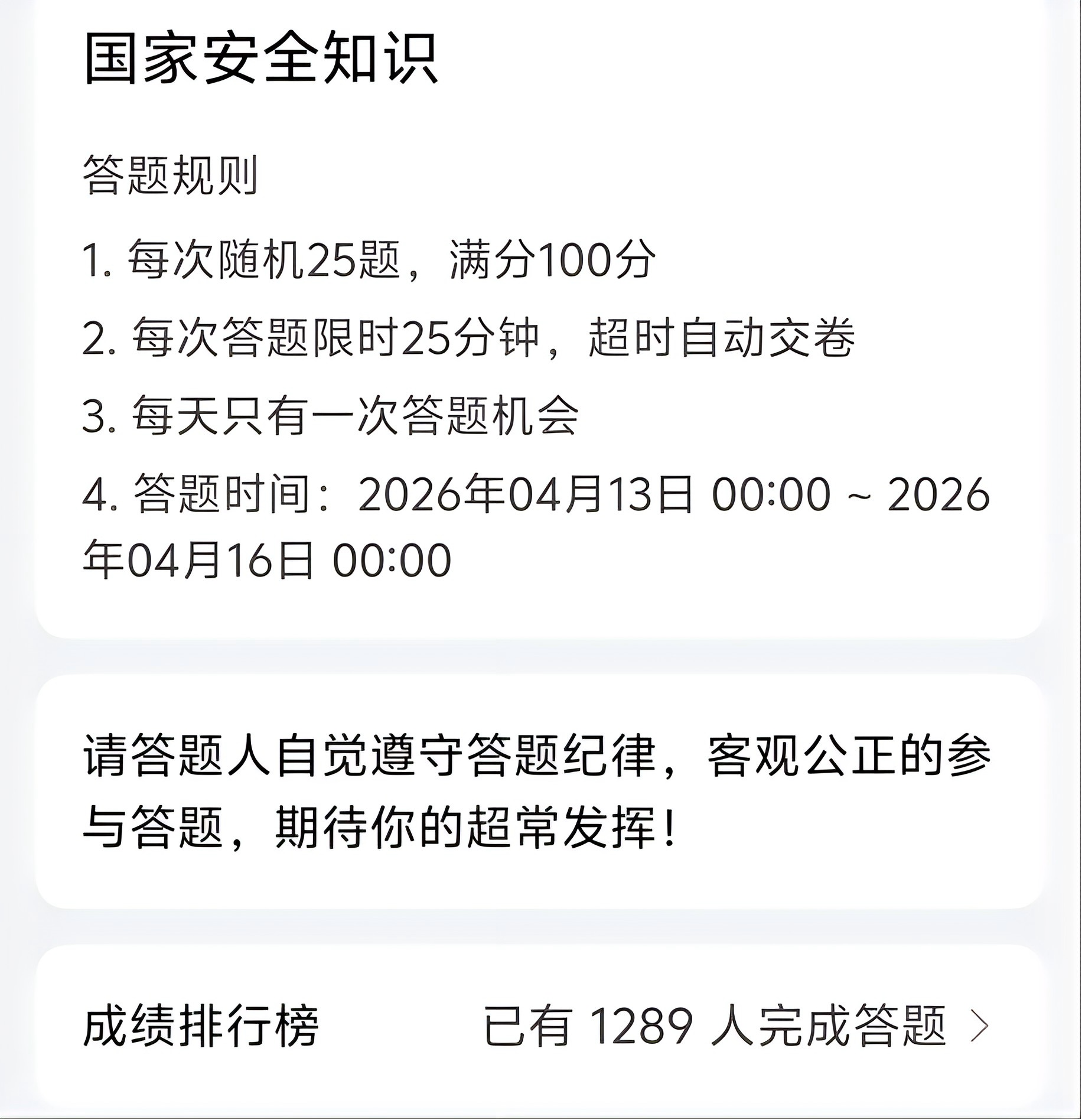 活动前期,校学生会通过微信公众平台,带领青年学子学习了国家安全相关法律法规,领会了总体国家安全观的丰富内涵与核心要义,推动国家安全知识入脑入心。本次活动开展,依托线上答题平台进行,题库紧扣国家安全核心内容,涵盖《中华人民共和国国家安全法》《中华人民共和国反间谍法》《中华人民网络安全法》等法律法规,以及政治安全、网络安全、社会安全、生态安全等重点领域知识,兼具知识性、时效性与趣味性。活动得到了1289名学生参与,同学们在云端展开知识比拼,认真作答每一道题目,系统学习国家安全相关知识,深刻领会维护国家安全的重要意义,进一步提升自身维护国家安全的自觉性与责任感。