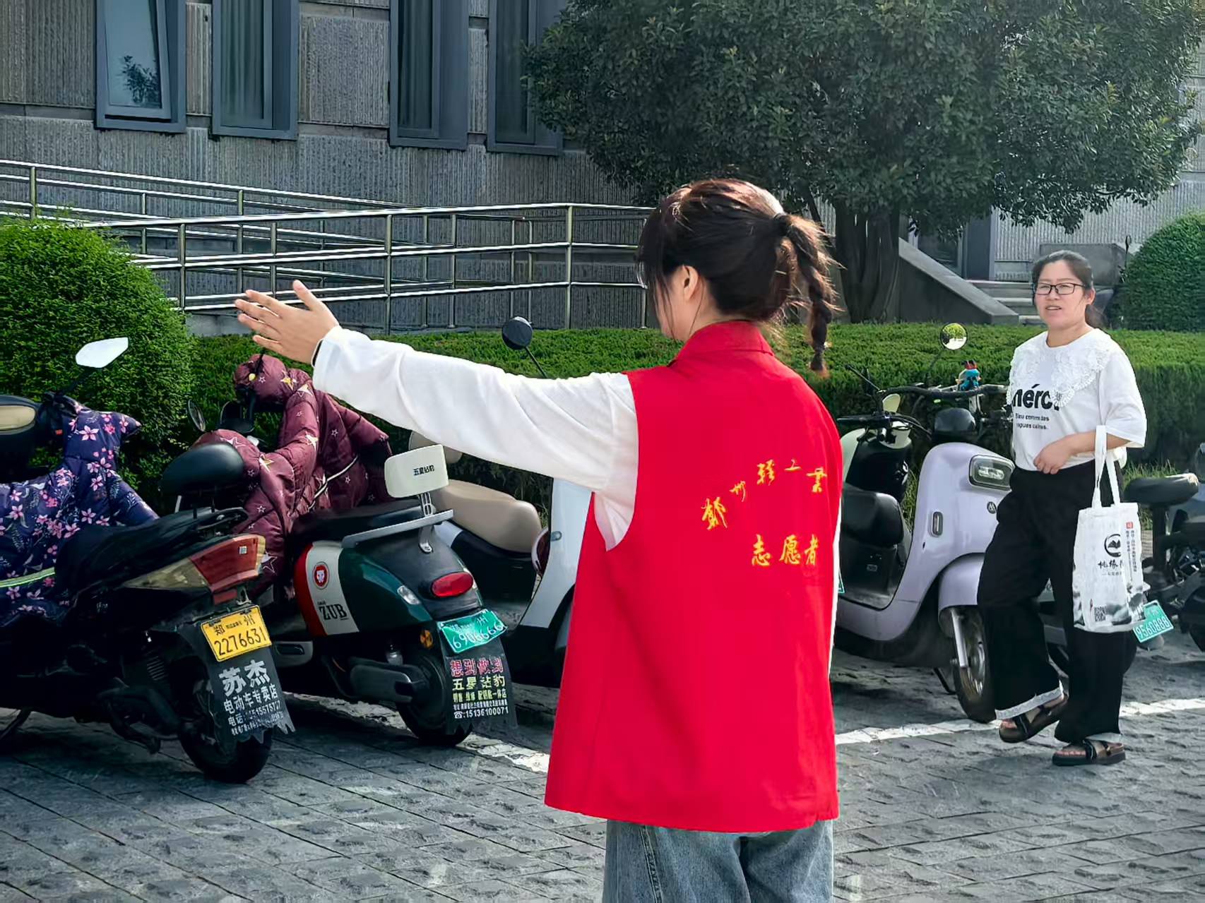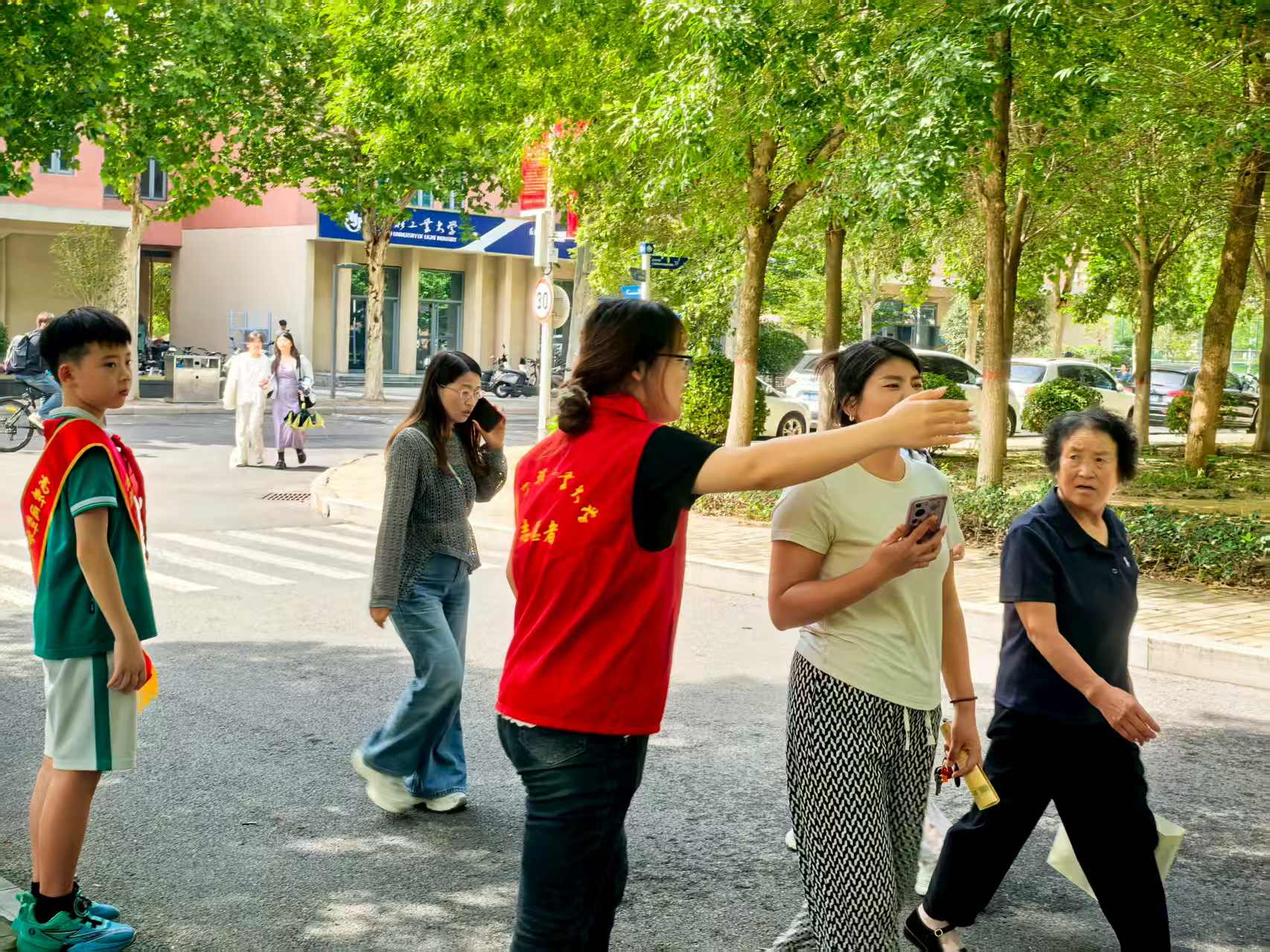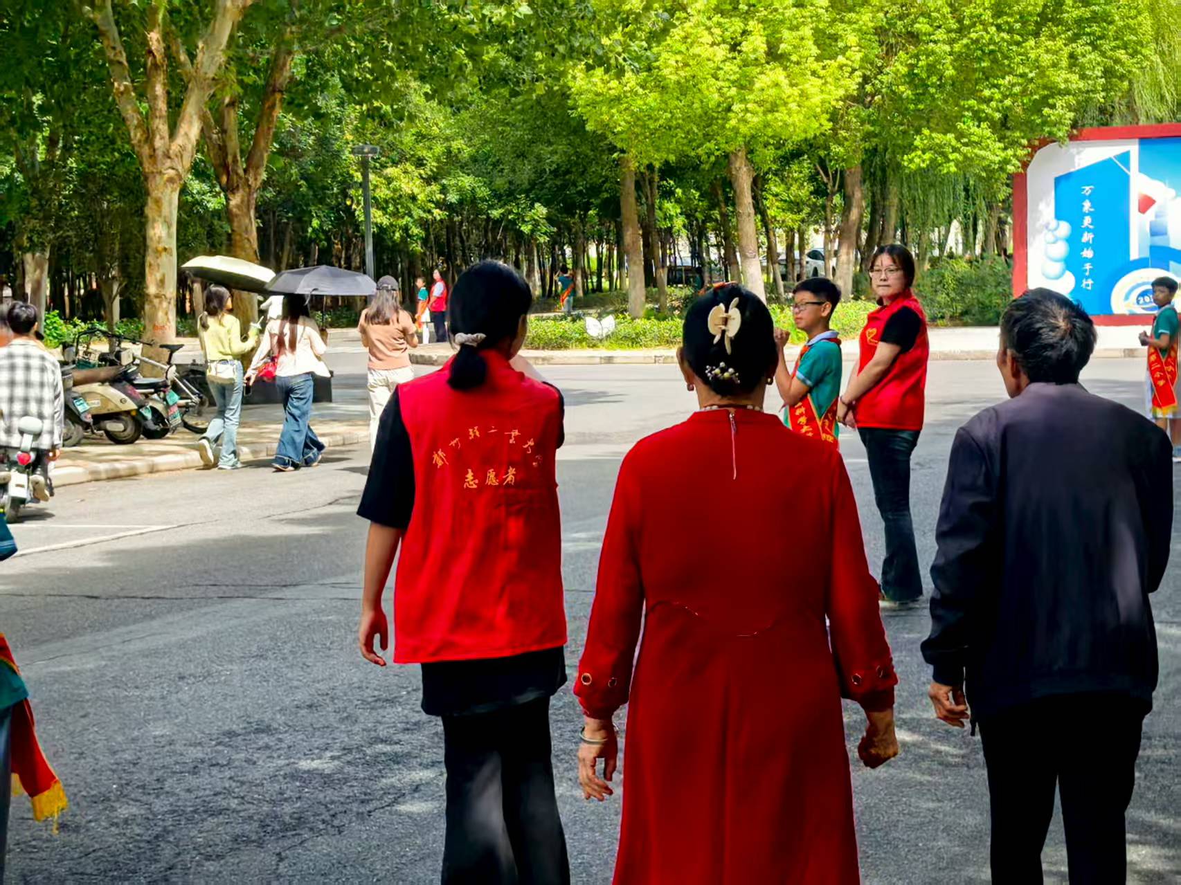 活动当天,志愿者们早早抵达校西门口、图书馆入口等关键点位,大学生志愿者身着统一红色马甲,小学生志愿者佩戴红领巾和礼仪绶带,他们精神饱满、配合默契,成为各服务点亮眼的“最佳搭档”。面对前来参加论坛的家长,志愿者们主动上前问候,耐心解答路线咨询,清晰指引方向,全程提供贴心引导。大学生们以身作则,诠释着责任与担当;小学生们在实践中体验奉献、学会合作。他们的协同服务,有效确保了家长们有序、快速进入会场,赢得了现场家长的一致好评。